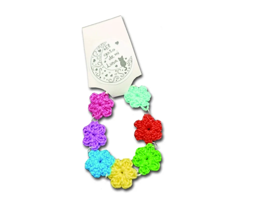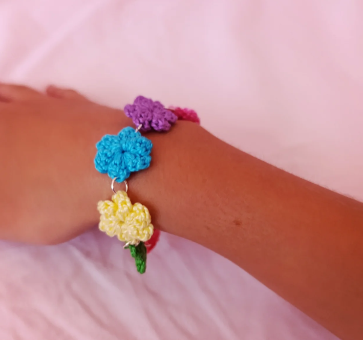¿Quién dijo que las flores solo se disfrutan en el jardín? Esta pulsera de crochet llega para demostrar que la alegría también se lleva en la muñeca. Hecha a mano con amor, cada florecita de colores es como un mini estallido de felicidad que te acompaña a todas partes. 🌈